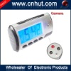 This product is a HD 30-frame (640 *480) remote camera monitoring clock with external TF card memory and a new high-tech multi-functional product integrating video making, sound recording, photo shooting, network chatting, electronic alarming clock and storage. This product is provided accompanying with high-capacity battery, which can provide successive video making over 12 hours and successive sound recording over 25 hours. Functions: 2 million pixel HD video making, photo shooting, electronic chiming in multiple languages, supporting 32GB TF card; it can work for a long time. It is more convenient for remote operations. Featuring high imperceptibility, it is a best helper for household, anti-theft and evidence collection.Operation Instructions:1. Open the twist-off cap on the right, insert the TF card, and press "ON" to start up. 2. Press"power key"slightly to start up through using the remote controller to point at the receiving head of this machine; the blue light turns on; enters into standby status. 3. Press "video key" to enter video making; the blue light will glitter for three times, and it will turns off automatically, and then it will enter into working status; press "video key" to stop, and the blue light will be on. 4. Press "sound key" to enter sound recording; the blue light will glitter for twice, and it will turns off automatically, and then it will enter into working status; press "sound key" to stop, and the blue light will be on.5. Press "Detect key" to sensing camera; press once for one photo; and the blue light will glitter for once. 6. Press "power key" to turn off; and the blue light will be off. 7. Insert USB wire and then turn on the remote controller when the machine is on; at this time, the machine will enter into U-disk mode. 8. Operation of network camera: before using, please install the driving software in the CD; when the machine is on, turn on "power key" with the remote controller; insert the USB wire to connect the computer. Enter into PC CAM mode at this time. 9. Charging: when the master switch is at the OFF position, insert USB battery charger; the red light will be on at this time; and the red light will be off when the battery is full. The computer USB also can be used to charge. 10. Reset: when the product stops responding due to illegal operation or other undetermined reasons, stir the switch to OFF position. And then stir it to ON position to reset this machine. 11. The blue light will glitter continuously when the battery is low; and charge it at this time. When the battery runs out, the files will be saved automatically. 12. When the program is missing, install the driving software in the CD first; click STK02NU system upgrading tool; and then click "update". Select 0 * 35 after1 DRAM Timing. Select "8M" after 2 DRAM Size, and press OK to record for several minutes; after that, press "OK".
